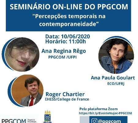 O evento será realizado na próxima quarta-feira, 10 de junho, às 11h, na sala do zoom https://bit.ly/EventoNujoc-PPGCOM e contará com a participação do historiador francês Roger Chartier da Escola de Altos Estudos em Ciências Sociais- Collège de France e das professoras doutoras Ana Regina Rêgo do PPGCOM-UFPI e Ana Paula Goulart do Programa de Pós-Graduação em Comunicação da ECO-UFRJ.