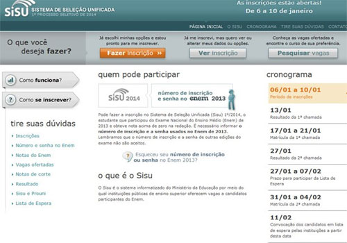 Balanço do Ministério da Educação divulgado no fim da tarde desta segunda-feira (6) mostra que 1.058.715 estudantes já fizeram inscrição para as mais de 171 mil vagas do Sistema de Seleção Unificada (Sisu) do primeiro semestre de 2014. O prazo de inscrição foi aberto pouco depois da meia-noite desta segunda e vai até as 23h59 (de Brasília) desta sexta-feira (10). Os mais de 5 milhões de candidatos que fizeram o Exame Nacional do Ensino Médio (Enem) em 2013 poderão concorrer a uma das vagas em cursos superiores oferecidas por universidades federais, estaduais e institutos federais.