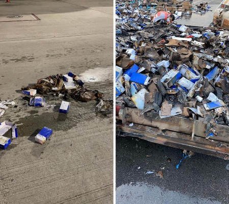 Um vídeo mostra o ocorrido e, nas imagens, é possível ver o fogo tomar conta dos produtos. Outros dois paletes com Vivo Y20 e acessórios também foram atingidos.