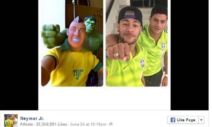 Exemplo disso é o craque da seleção brasileira Neymar. Uma imagem postada ao lado do atacante Hulk alcançou impressionantes 2,6 milhões de curtidas, 71,5 mil compartilhamentos e 39 mil comentários. Das 20 postagens de atletas que disputam a Copa do Mundo mais curtidas, 12 são da dupla Neymar e David Luiz, com sete e cinco respectivamente. O craque argentino Messi tem quatro, Cristiano Ronaldo, três, e Bastian Schweinsteiger, uma.