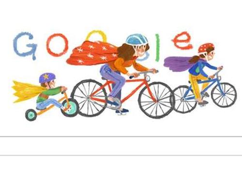 O novo Doodle da página de buscas do Google faz homenagem ao Dia das Mães neste domingo. A imagem mostra uma "supermãe" andando de bicicleta com duas crianças também com capas de super-heróis.