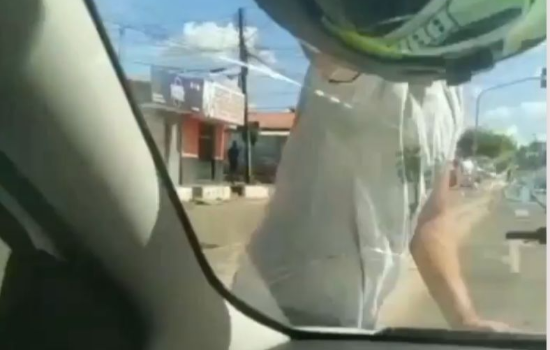 Um vídeo mostra o momento em que homem se dirige ao carro e dá um soco no retrovisor esquerdo do veículo. Após esbravejar, ele segue em direção à motocicleta, mas volta e efetua um golpe usando um capacete contra o para-brisas dianteiro do carro da motorista. O impacto é tão forte que o vidro chegar a trincar.