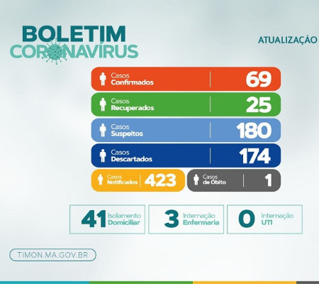 A cidade de Timon registrou o seu primeiro óbito por Coronavírus, segundo informou o boletim epidemiológico da Secretaria de Saúde do município atualizado na noite de terça- feira (12/05). O boletim aponta 423 casos notificados, 180 casos suspeitos, 174 casos descartados, 69 casos confirmados, 25 casos descartados e 1 óbito.