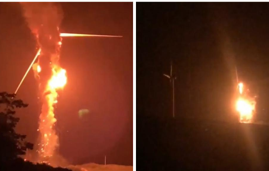 Moradores da região registraram o momento em que as chamas atingiram o topo da torre bem próximo às hélices. Na gravação, é possível ver que ao cair, as faíscas geraram uma pequena explosão ao tocar na fiação elétrica de um poste localizado logo abaixo da estrutura.