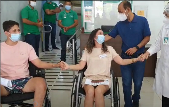 Ao receber alta, os profissionais de saúde que acompanharam os pacientes se despediram com aplausos e homenagens.