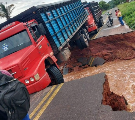 Na madrugada desta quinta-feira (18), um trecho da MA-012 se rompeu em razão das fortes chuvas entre as cidades de Esperantinópolis e São Roberto, no interior do Maranhão. Imagens divulgadas nas redes sociais mostram que um caminhão ficou pendurado na grande cratera que se formou e cortou a rodovia estadual.
