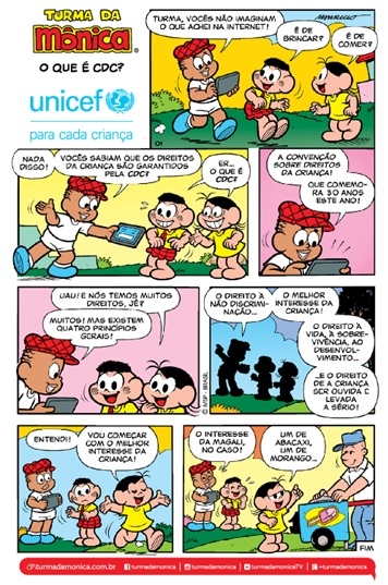 Mais uma vez, a Mauricio de Sousa Produções e o UNICEF unem forças para iniciar um diálogo com os leitores – dos pequeninos aos grandões – sobre assuntos importantes. Agora é a hora de falar sobre a Convenção sobre os Direitos da Criança, que completa 30 anos este ano. Para isso, uma vez por mês, as revistas impressas da Turma da Mônica vão receber uma página especial para explicar todos direitos que devem ser garantidos aos pequenos.