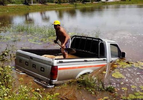 Segundo informações, o motorista conhecido como "Panzoá", ao tentar estacionar o veículo modelo Pick up Ford, para efetuar um descarregamento, perdeu o freio e acabou adentrando no açude estragando toda a carga do veículo. O motorista conseguiu sair do carro ileso.