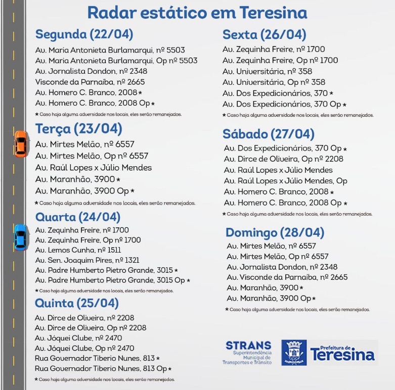 A Prefeitura de Teresina divulgou na manhã desta segunda-feira (22/04), a localização dos radares durante toda essa semana na capital. Para dar mais transparência aos teresinenses, a lista com a localização dos radares é sempre divulgada no site, já que a presença dos radares é importante para diminuir e prevenir o número de acidentes, assim como dar maior fluidez ao trânsito.