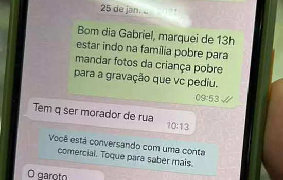 O funcionário avisa: "Bom dia, Gabriel, marquei de 13h estar indo na família pobre para mandar fotos da criança pobre para a gravação que você pediu". O vereador responde: "Tem que ser morador de rua, o garoto. Cabeludo, em estado precário, pra gente conseguir mudar a estética dele", escreveu Monteiro.