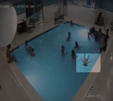 De acordo com as imagens, uma criança de dois anos é vista agitando os braços perto dos degraus da piscina. Aos poucos, o bebê vai afundando sem ninguém perceber, até desaparecer completamente.