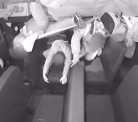 O motorista Danny Gupp, de 74 anos, por sua vez, demonstra calma e orienta os jovens a saírem pelas janelas e saídas de emergência. Ele não foi lançado ao ar porque era o único usando cinto de segurança,