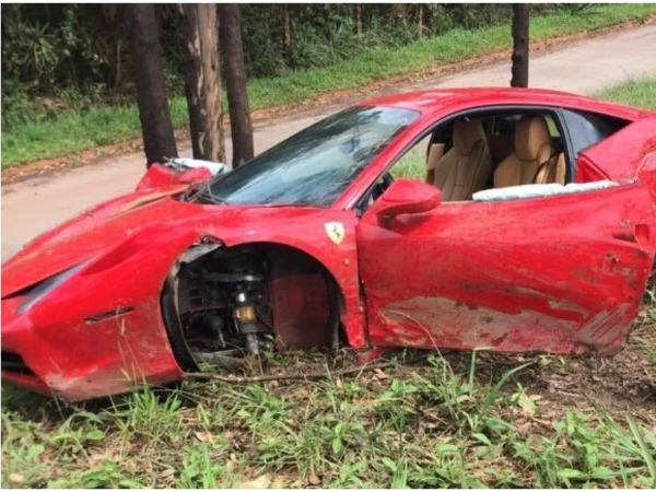Em registros compartilhados, é possível ver a lataria do carro bastante amassada. O impacto foi tão grande que a Ferrari perdeu as rodas e o motor.