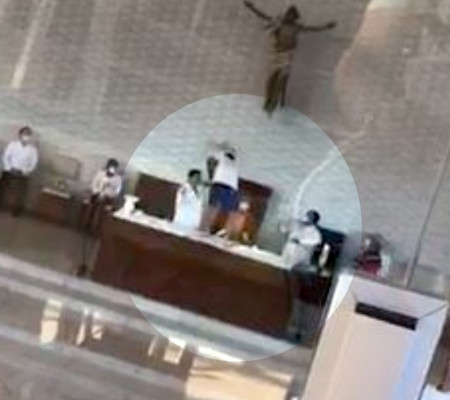As imagens mostram quando o homem ameaça as pessoas em volta, ele tenta dar um soco em um dos homens, mas se distrai e é derrubado caindo no chão. Ele foi imobilizado e levado carregado pelos fiéis para fora da igreja.