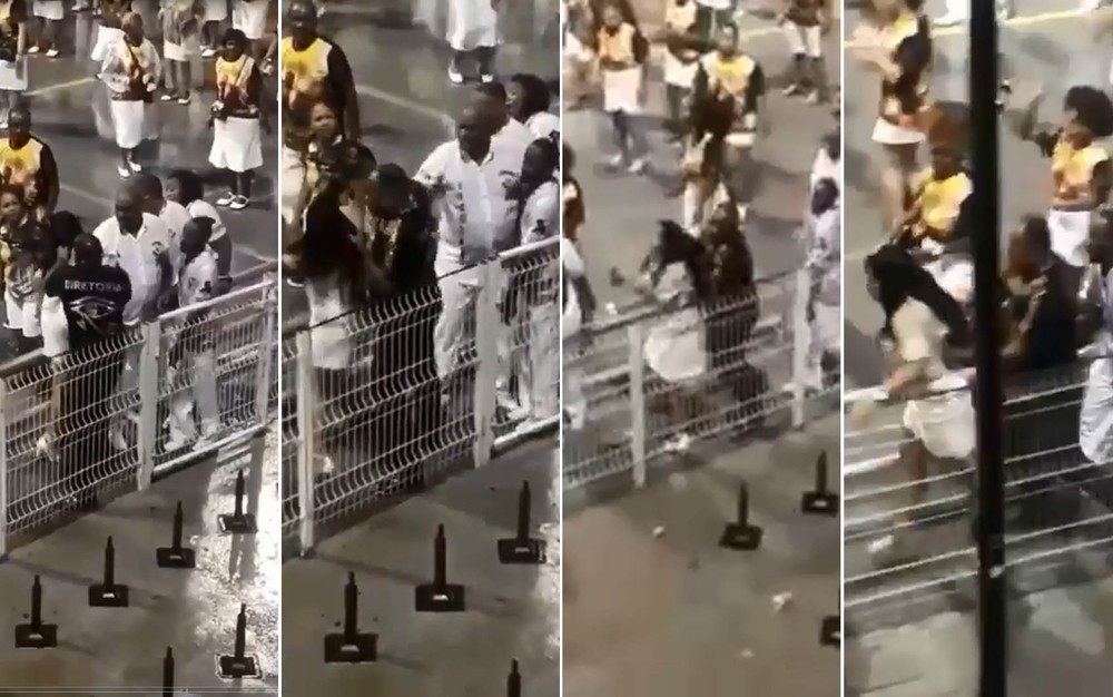 No vídeo é possível ver a mulher caminhando na lateral da avenida. Um homem com uma camiseta de “diretoria” vem logo atrás e a puxa pelos cabelos. Outros integrantes tentam separar, mas o homem segue empurrando a mulher. A plateia reage e grita “Maria da Penha”, em referência à lei de proteção às mulheres vítimas de violência.