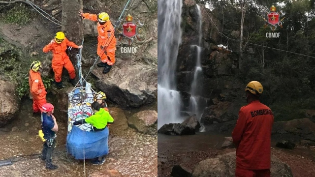 Para garantir o atendimento adequado, a equipe de resgate imobilizou a vítima em uma prancha do CBMDF e providenciou duas mantas térmicas para mantê-la aquecida. Após os primeiros procedimentos, ela foi transferida para uma maca do tipo cesto. A remoção foi realizada por meio de uma tirolesa até o topo da cachoeira.