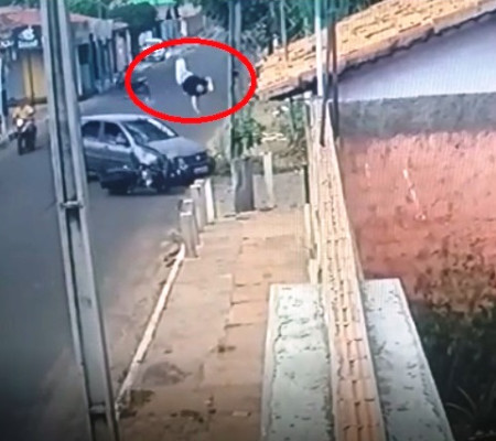 Com a força do impacto, ele é lançado da moto e cai bruscamente em uma calçada. Mateus foi lançado por uma altura de 3 metros, bateu em um poste e depois caiu na calçada. Nas imagens percebe que Mateus, aparentemente, sai do acidente sem fraturas ou outro tipo de lesão grave, já que levantou-se em seguida.