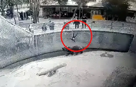 Imagens da CCTV mostram visitantes que estavam ao redor horrorizados após a criança ser arremessada dentro da jaula do urso chamado Zuzu. O urso chegou perto da menina depois que ela caiu, mas não chegou a feri-la.