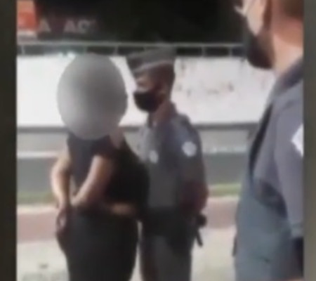 Em meio aos xingamentos, a mulher alega que está defendendo a filha e a mãe, apesar dos policiais estarem quietos durante toda a abordagem.