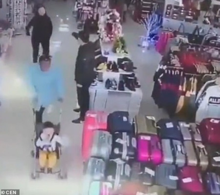 Em seguida, uma pessoa, de casaco azul claro, se aproxima, fala rapidamente com a criança e começa a empurrar o carrinho tranquilamente para fora da loja. Felizmente, um funcionário percebe e impede a pessoa de sair. Algumas pessoas tentam localizar a mãe, que chega alguns segundos depois.