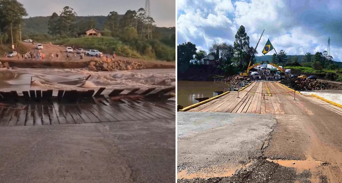 Uma ponte provisória localizada em Feliz (RS), a aproximadamente 80 km de Porto Alegre, foi levada pela correnteza do Rio Caí devido às fortes chuvas que atingiram o estado na última quinta-feira (2).