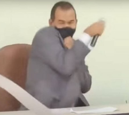 O prefeito de Tabocas do Brejo Velho, no interior da Bahia, quase foi atingido por uma enxada durante a cerimônia de posse no cargo, realizada ontem na Câmara dos Vereadores Um vídeo registra o momento em que Flávio da Silva Carvalho (PP) é surpreendido pela tentativa de atentado, se assusta e levanta de sua cadeira. As informações são do UOL.