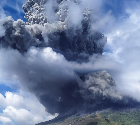 O fenômeno natural aconteceu ainda pela manhã no horário local. Por volta do meio-dia, a nuvem gigante originada no pico de 2.460 metros do vulcão escondeu a luz solar e deu aspecto de noite à ilha, tornando a erupção ainda mais assustadora. Isso porque moradores relataram um forte barulho no início do fenômeno.