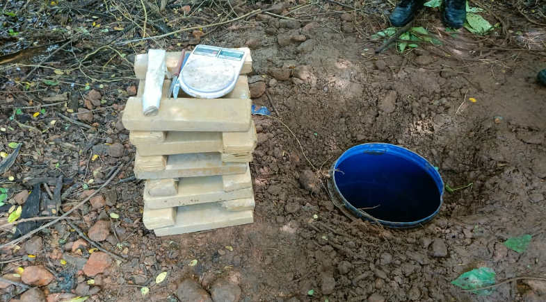 Segundo a PM, foram apreendidos 18 tabletes e uma balança de precisão dentro do compartimento no matagal. Os entorpecentes estavam enterrados e parcialmente encobertos, o que indica tentativa de ocultação. O local apresentava sinais de movimentação recente.