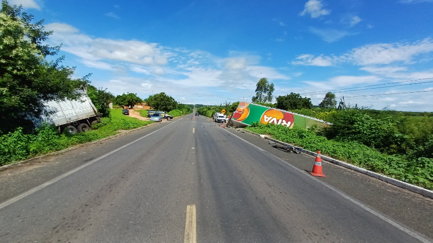 DINÂMICA DO ACIDENTE - De acordo com as informações levantadas pela Polícia Rodoviária Federal (PRF), que atendeu a ocorrência, ambos os veículos seguiam no mesmo sentido da via, quando o condutor de 42 anos não percebeu a existência de uma lombada na pista, perdeu o controle do caminhão que estava e colidiu na traseira do automóvel que estava a frente dele. Logo em seguida, os dois veículos de carga saíram da pista e tombaram às margens da rodovia.