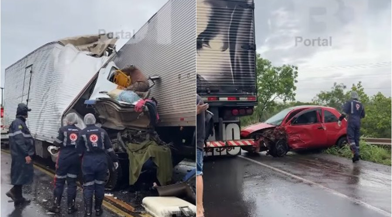 Um grave acidente registrado na manhã desta terça-feira (9), na rodovia BR-135, trecho do Povoado Santa Maria, município de Corrente, Sul do Piauí, deixou uma pessoa morta e feridos. A colisão envolveu duas carretas e um carro de passeio. Chovia no momento do acidente.