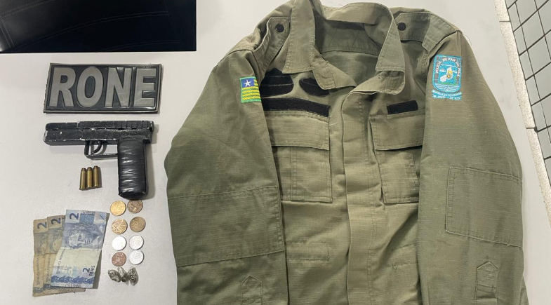 Após a abordagem, os agentes localizaram a sacola e constataram a presença de diversos itens ilícitos, entre eles uma arma de fogo artesanal, três munições de calibre .38, uma gandola verde-oliva da Polícia Militar do Piauí (PMPI), três trouxinhas de maconha e R$ 8,55 em dinheiro. Todo o material foi recolhido e apresentado juntamente com o suspeito às autoridades competentes.