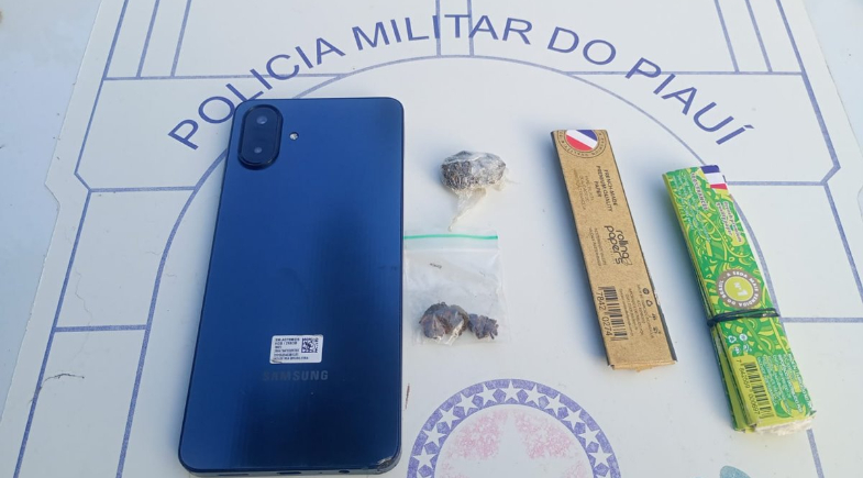 Celular e drogas apreendidos | Foto: Divulgação/PMPI