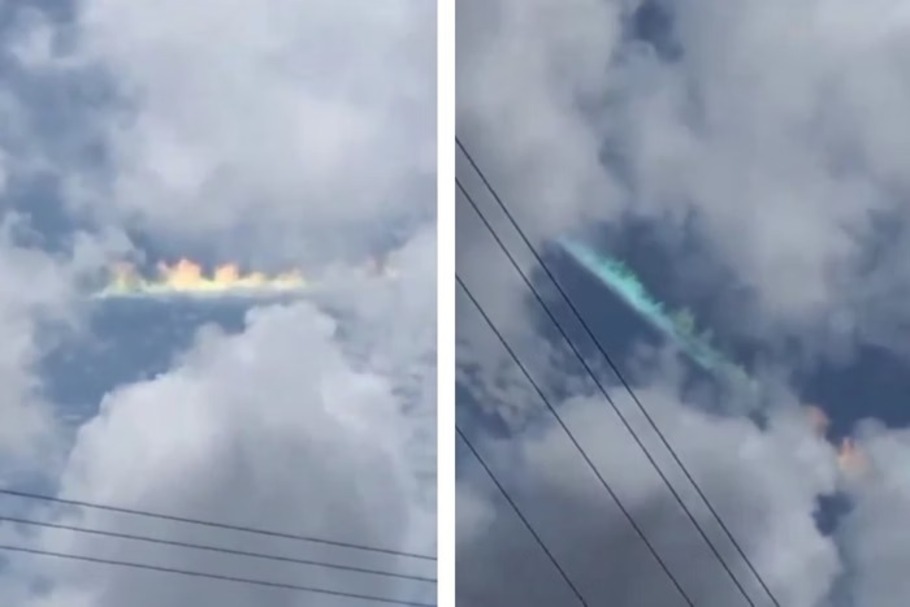O fenômeno, conhecido como nuvem iridescente, é formado pela difração da incidência da luz solar nas gotículas de água ou nos cristais de gelo nas nuvens ou de partículas na atmosfera, segundo o ClimaTempo.