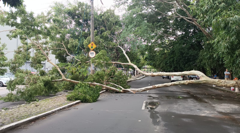 Até por volta das 12h30, a árvore ainda permanecia na pista e não havia equipes de órgãos competentes no local para realizar a retirada.  A situação continuava impactando o fluxo de veículos, gerando transtornos para quem passava pela avenida.