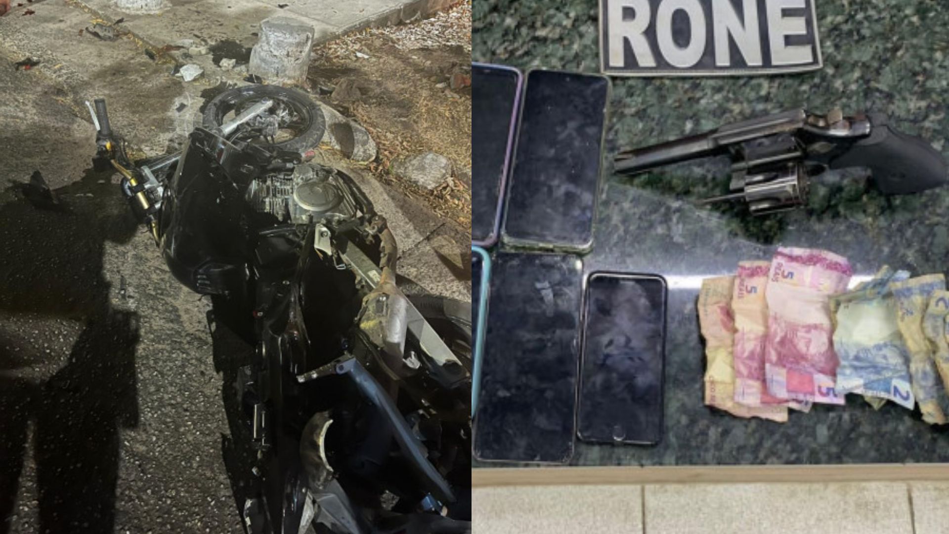 A dupla perdeu o controle da motocicleta e colidiu com um obstáculo de concreto. Após o acidente, foram encontrados em posse dos presos cerca de sete celulares roubados, um revólver calibre 38, cinco munições calibre 38, um relógio de pulso e R$ 27,00 em espécie.