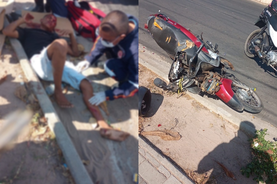 Montagem mostra o acusado de assalto ferido e a motocicleta que havia sido roubada bastante danificada, após o atropelamento na Avenida Henry Wall de Carvalho, zona Sul de Teresina, na tarde desta quarta-feira (28) | FOTO: Reprodução