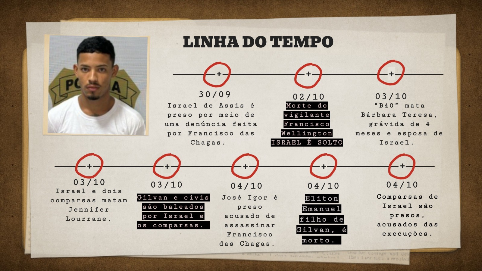 Simultaneamente, Israel mandou matar Francisco das Chagas Silva dos Santos, de 44 anos. O homem não tinha envolvimento com facções, e foi morto por denunciar Israel por roubo meses atrás - por isso, Israel estava utilizando tornozeleira eletrônica.