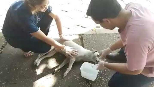 "Envenenaram essa cachorrinha que está sempre aqui nas proximidades, eu e mais alguns profissionais daqui nos reunimos e conseguimos fazer um antídoto com carvão ativado para tentar salvar ela, a gente acredita que o envenenamento tenha sido proposital, e que seja investigado".