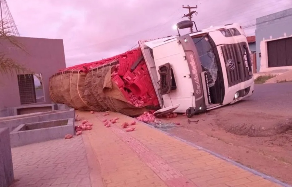 Um caminhão carregado de batatas tombou nas primeiras horas da manhã deste domingo (13), na BR-135, na cidade de Gilbués. Apesar do susto, ninguém ficou ferido, segundo divulgou o portal de notícias B1.