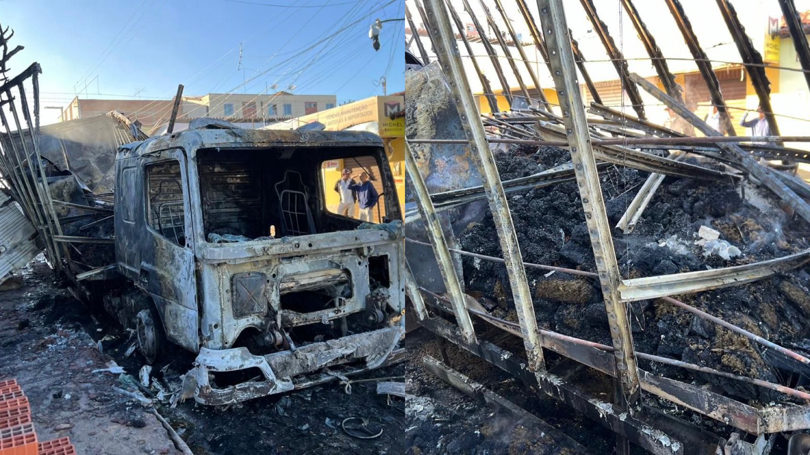 Caminhão apreendido por suspeita de tráfico de drogas pegou fogo em frente à delegacia. | Foto: Romário Mota