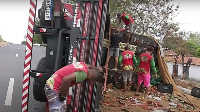 "Estourou o pneu dianteiro, aí o motorista disse que perdeu o controle e chegou a capotar. O motorista está bem, levou só uma pancada leve na mão, mas está bem. O prejuízo vai ser cerca de 40% do valor da carga, cerca de R$ 20 mil, fora o valor do caminhão", disse Flávio.