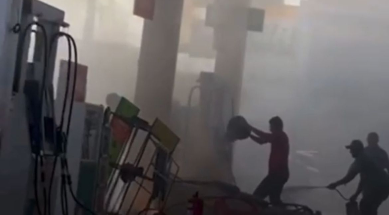 Imagens compartilhadas em aplicativos de mensagem registraram o momento em que as chamas tomaram conta da bomba. Nos vídeos, é possível ver quatro homens tentando conter o incêndio com extintores e baldes de água.