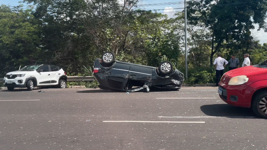 Uma grave colisão entre dois carros, que causou o capotamento de um dos veículos, ocorreu no início da tarde desta quarta-feira (13) na Ponte Wall Ferraz, no bairro São João, na Zona Sudeste de Teresina. Apesar do forte impacto, os motoristas não sofreram lesões graves. A Polícia Militar esteve no local para atender a ocorrência.