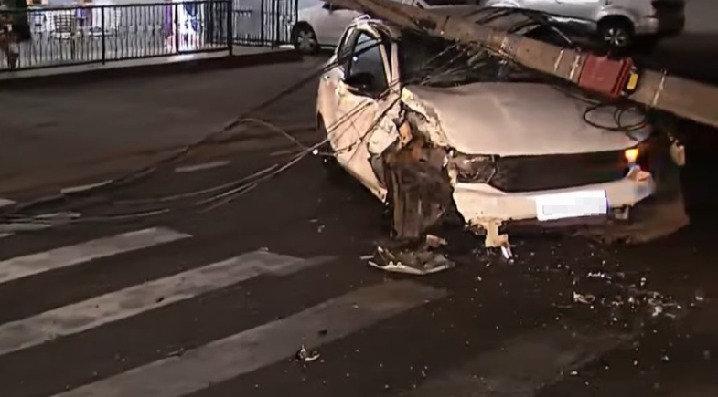 Informações preliminares apontam que a condutora do carro teria colidido na motocicleta e em seguida batido no poste de iluminação pública, que acabou caindo sobre o carro.