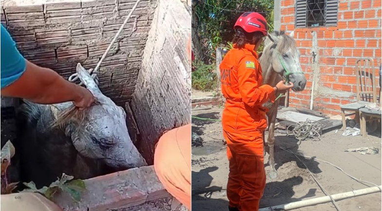 Um cavalo caiu em uma fossa no povoado Lagoa da Mata, zona rural de Teresina, na manhã desta segunda-feira (15). O Corpo de Bombeiros do Piauí esteve no local para resgatar o animal.