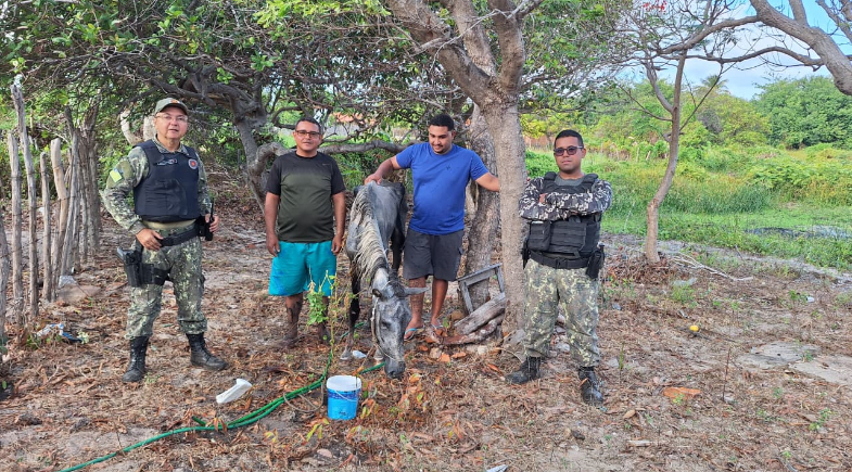 O animal passou horas preso na lagoa no povoado Tatus, zona rural do município de Ilha Grande do Piauí. O resgate só foi possível após uma moradora acionar a equipe da Polícia Ambiental.