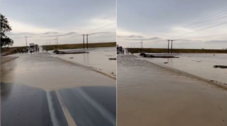 Um trecho da BR-135, na zona rural de Santa Luz, no Sul do Piauí, ficou alagado depois da chuva que caiu na tarde desta terça-feira (25). A água de um riacho que passa perto da rodovia transbordou e tomou parte da pista, provocando uma interdição temporária e engarrafamento. O videomaker Janderson Santos, que passava pelo local de carro, registrou imagens de veículos que ficaram parados por causa da água.