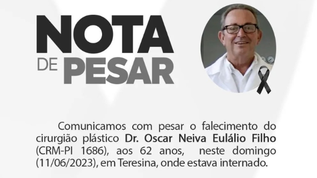 Comunicamos com pesar o falecimento do cirurgião plástico Dr. Oscar Neiva Eulálio Filho (CRM-PI 1686), aos 62 anos, neste domingo (11/06/2023), em Teresina, onde estava internado. Dr. Oscar trabalhava em Picos e deixará saudades. Aos familiares e amigos, nossos sinceros sentimentos.