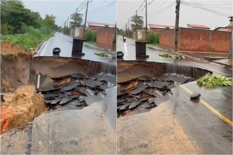 Vídeos registrados no local mostram os danos após a ruptura, que comprometeram o fluxo de veículos e pessoas pela via.