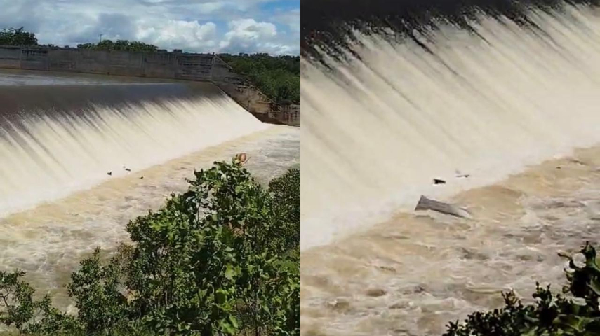 O QUE ACONTECEU: Um vídeo compartilhado hoje nas redes sociais mostra o momento em que a força da água da barragem de Piracuruca arrasta duas pessoas e uma canoa.